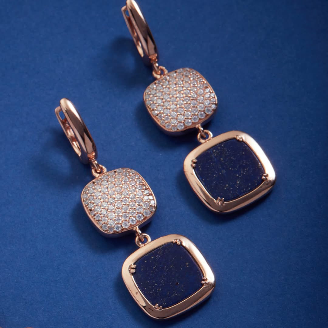 Orecchini pendenti in argento 925 anallergico placcato in oro rosa, pavè di zirconi e lapislazzuli, una bellissima pietra naturale di colore blu con venature oro.