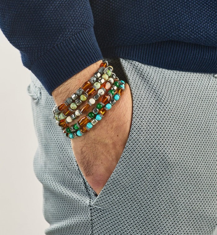 Bracciale elastico da uomo in diaspro, ambra e dadini di argento 925.