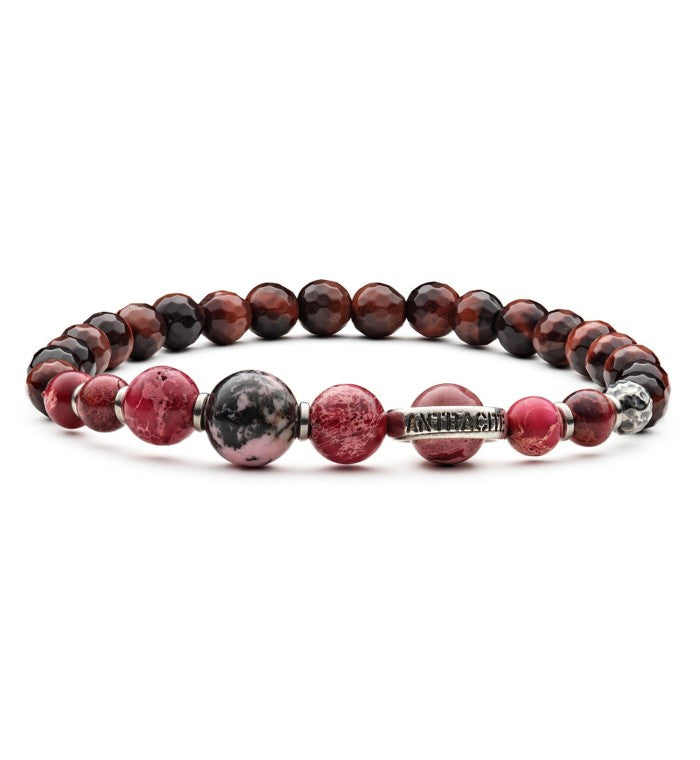 Bracciale elastico da uomo dedicato all’oroscopo in occhio di tigre rosso, diaspro rosso, rodonite e Argento Invecchiato 925%