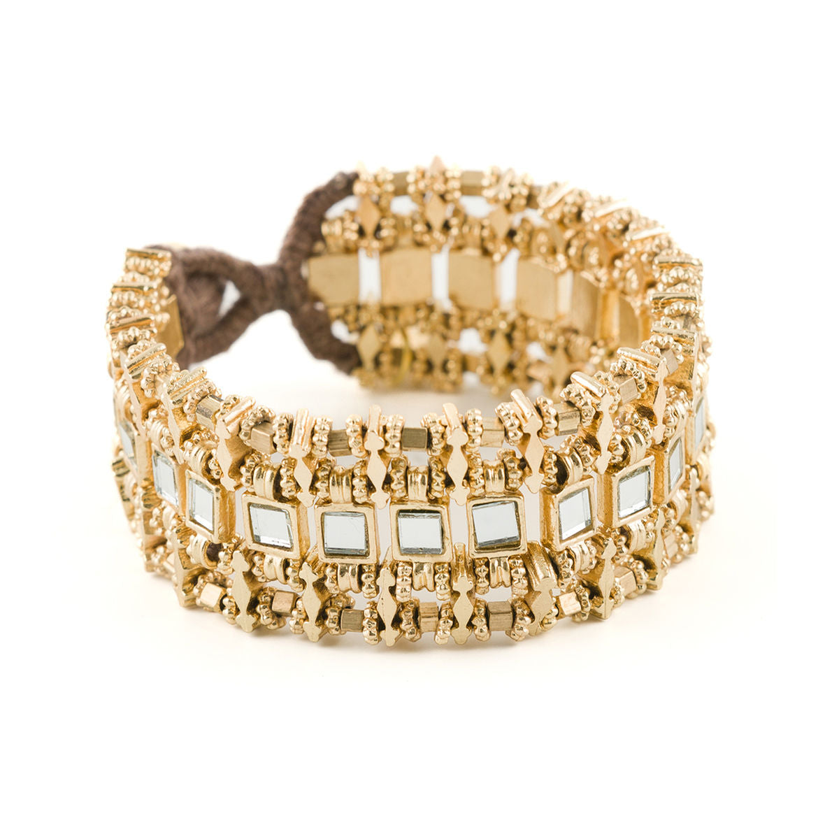 Bracciale tipo polsiera / manchette in stoffa e quadratini di specchio e placcato in oro giallo.