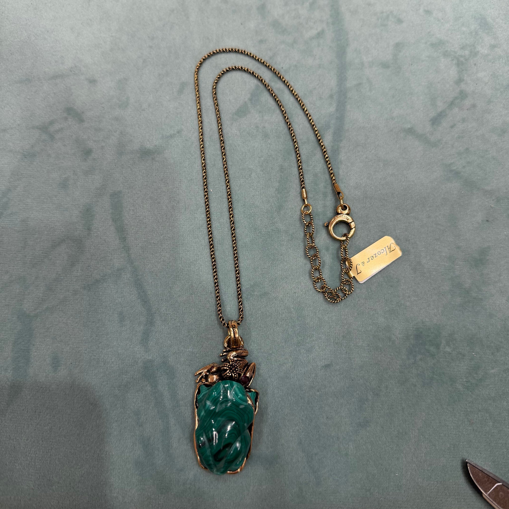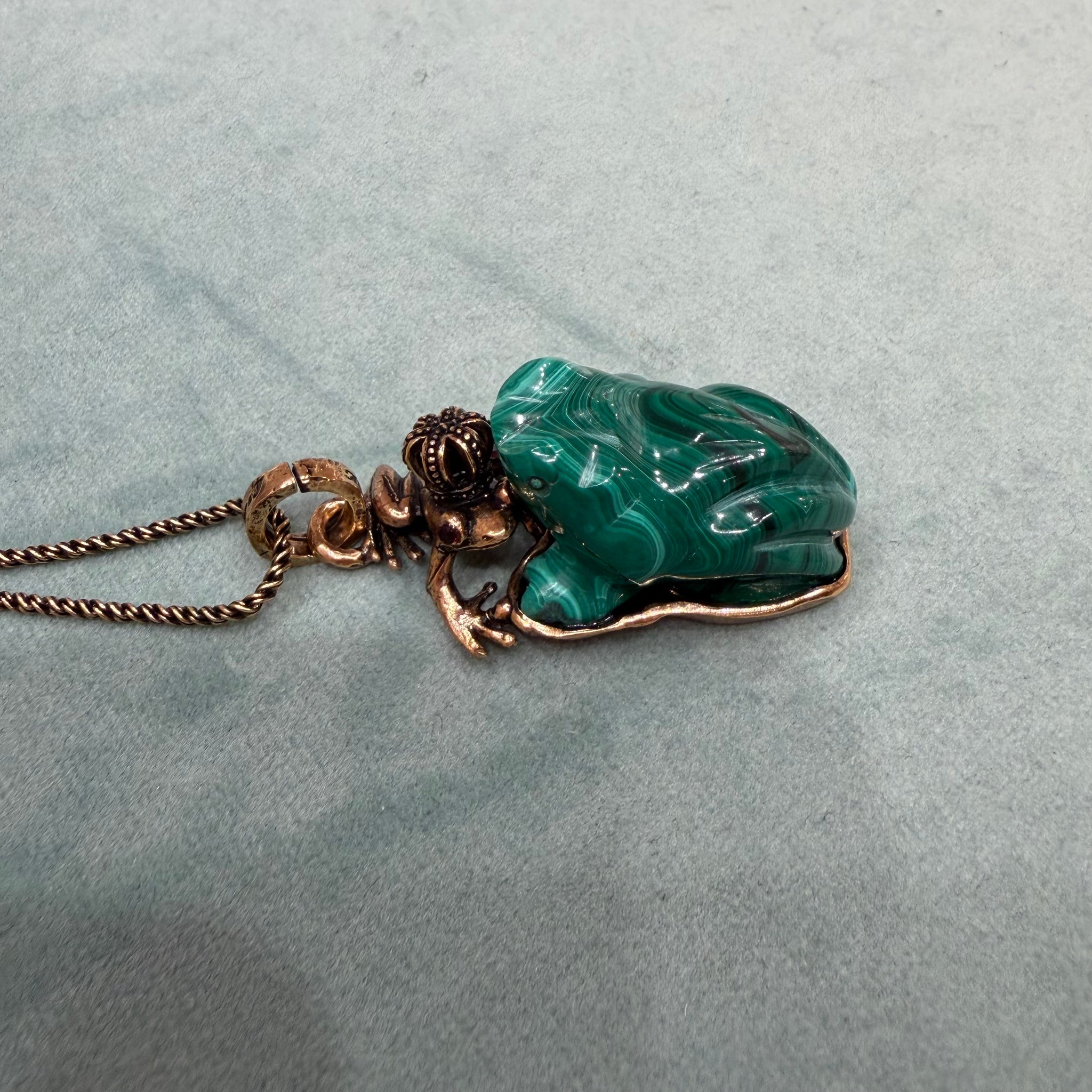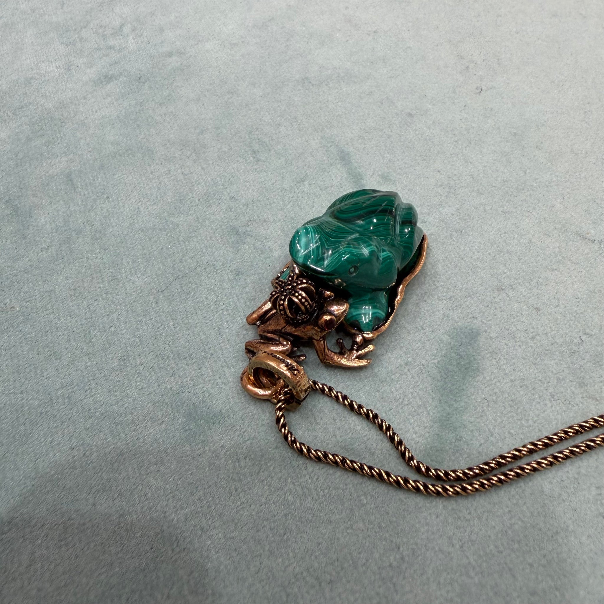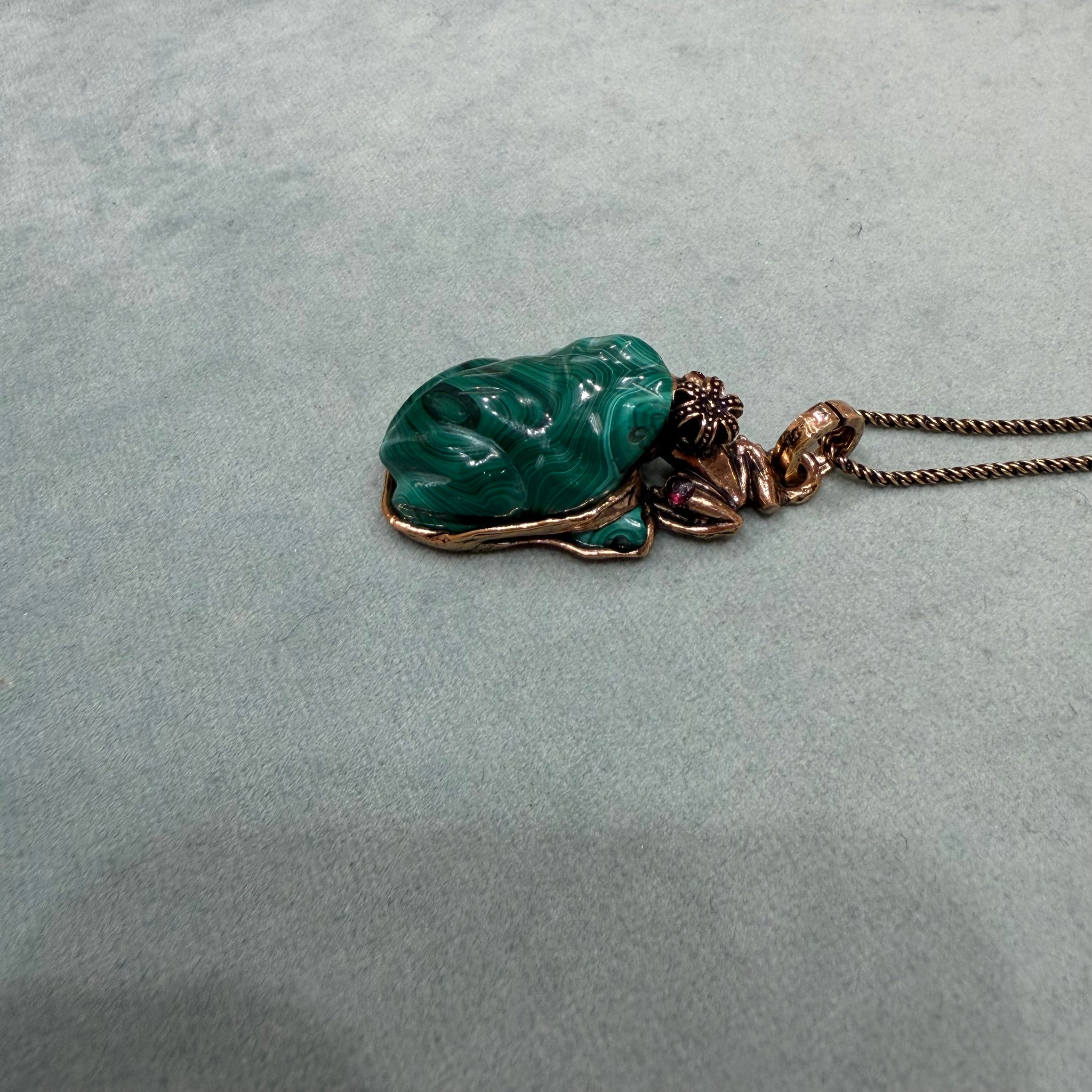 Collana con ciondolo in ottone e malachite scolpita a forma di rana, iconico simbolo di Alcozer. Sopra vi è un altro rospo con radici di rubino.