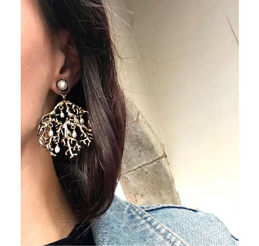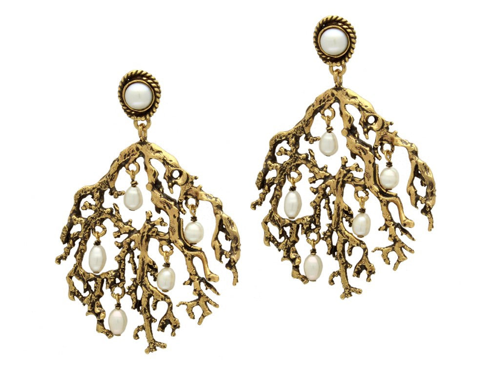Orecchini pendenti in ottone e perle. Chiusura con perno.