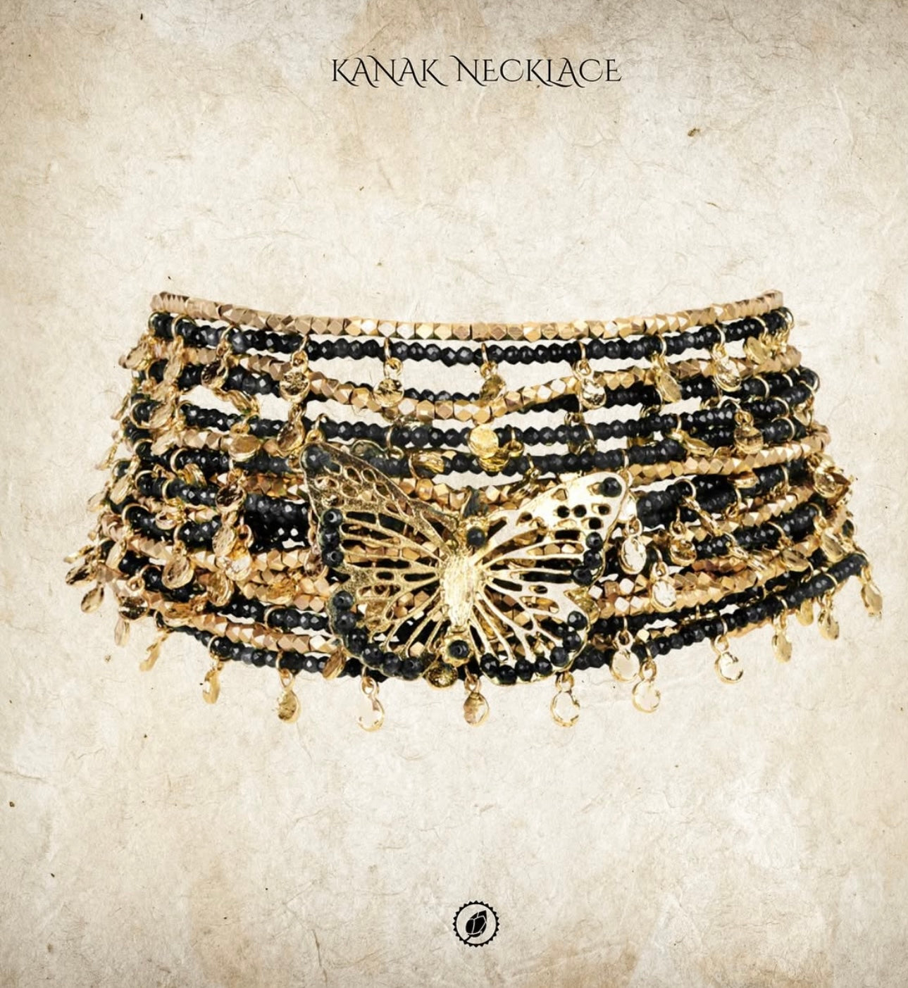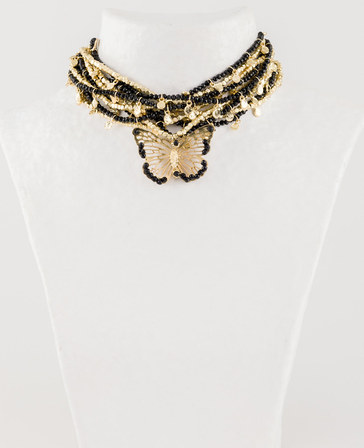 Collana modello multi filo con alternanza di pietre nero onice e fili placcati in oro giallo, con al centro una bella farfalla traforata con pietre nere sulle ali.