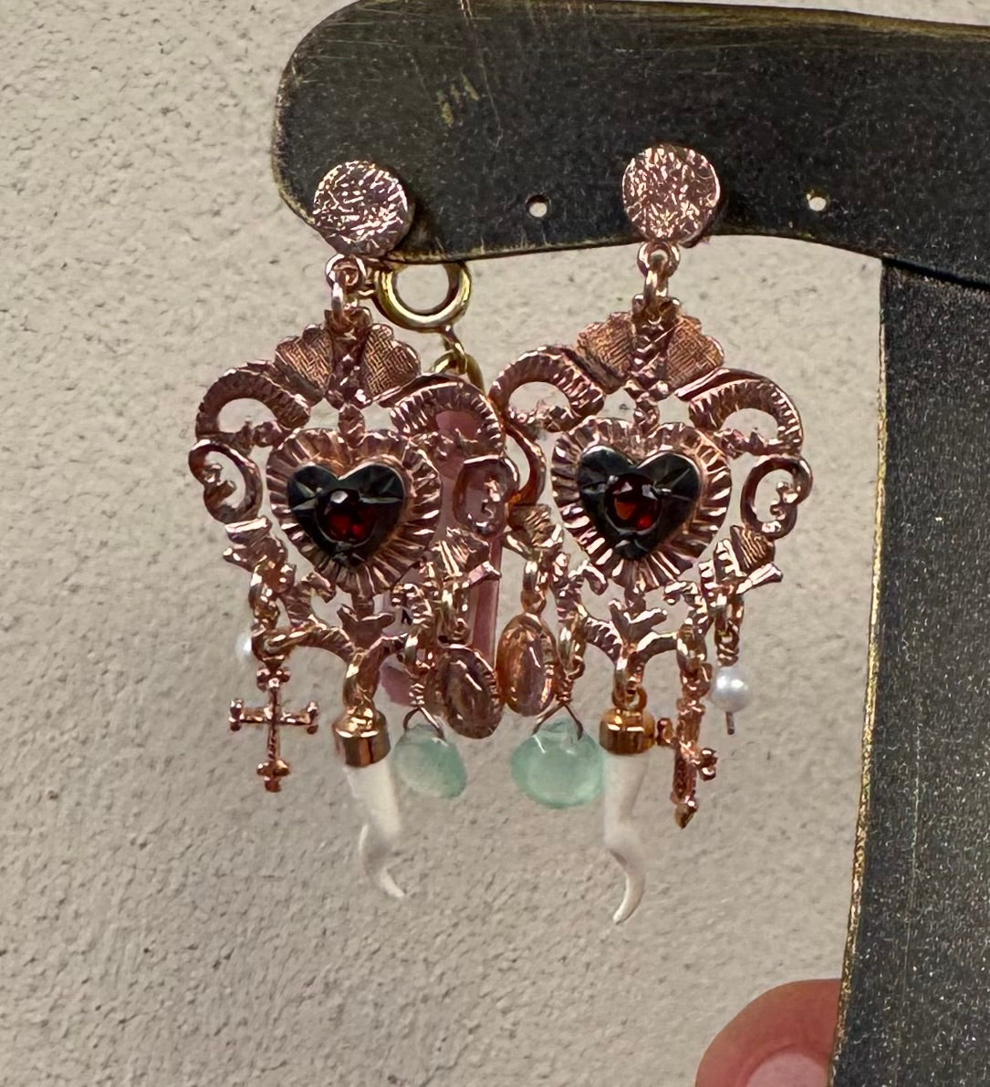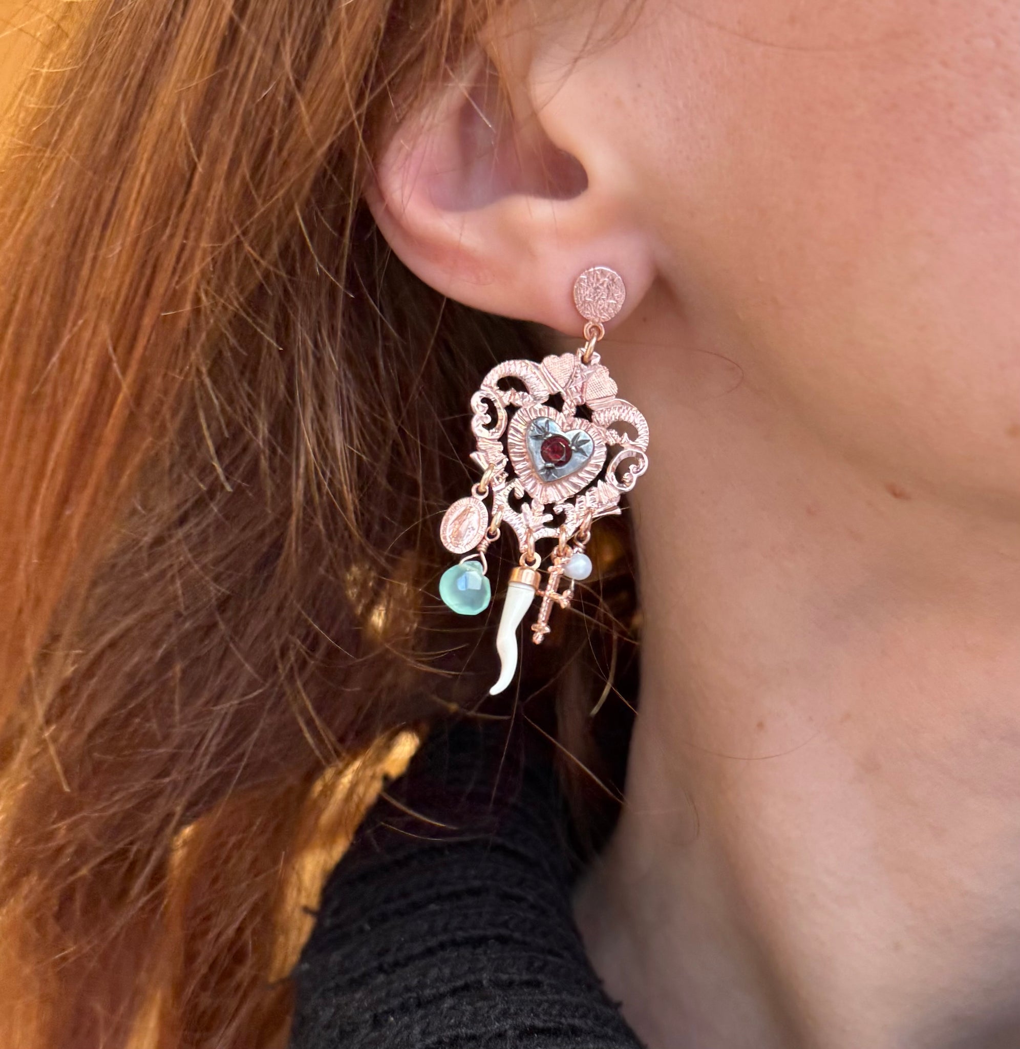 Gioielli in argento fatti a mano in italia, in argento placcato in oro rosa con un castone centrale brunito con una radice di rubino naturale. Pendenti in pietre e perle naturali con un corno in pasta di corallo, una madonnina ed una croce.