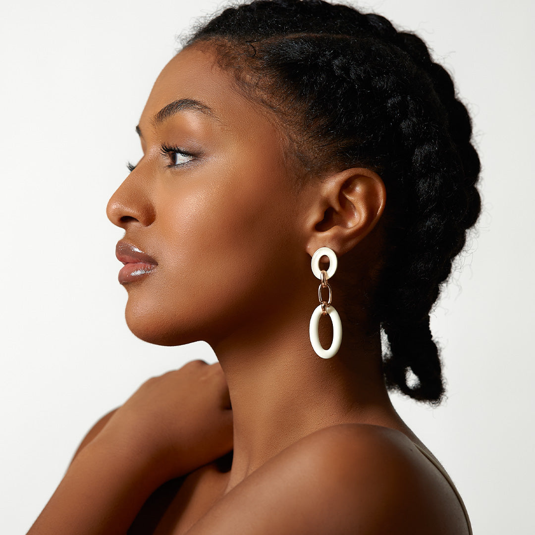 Orecchini realizzati in Italia, in legno d’ulivo laccato e smaltato a mano su una base palladio anallergico placcato oro 24 carati.