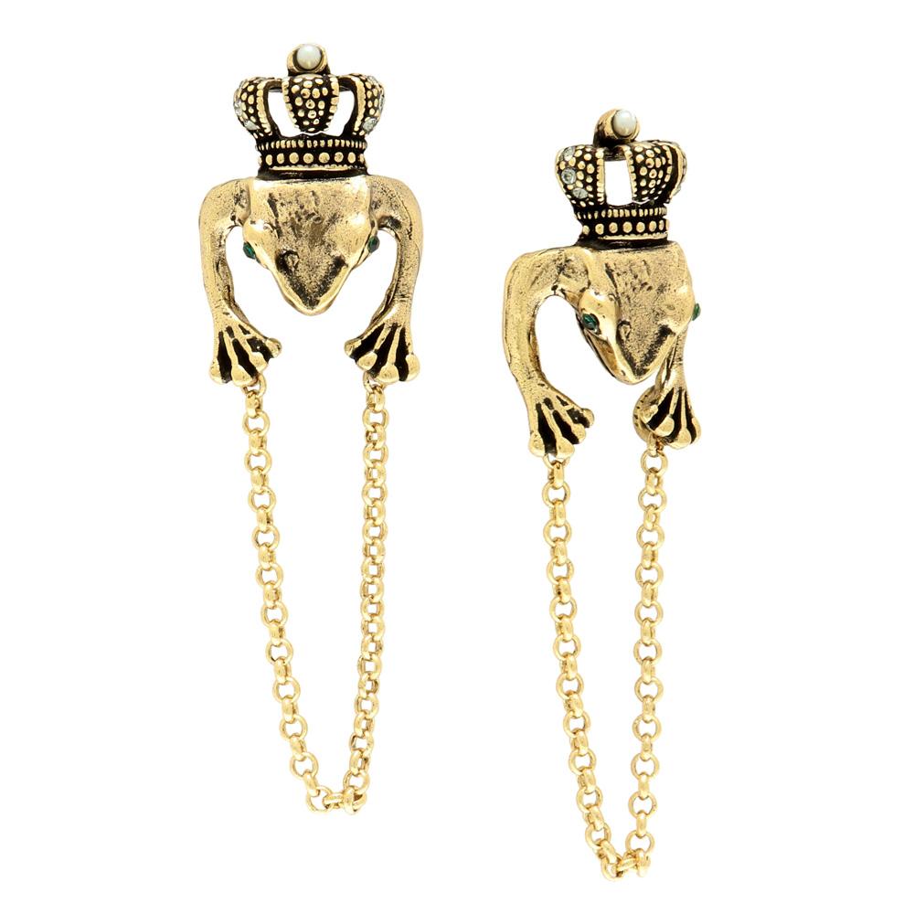 Orecchini realizzati da Alcozer & J in ottone, perle e occhi di smeraldo raffiguranti una rana incoronata con una catena fra le zampe.